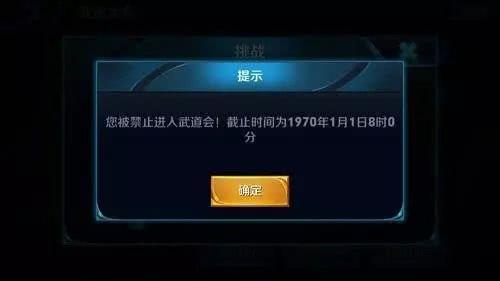 接下来我们再看看下面的截图,禁止进入武道会,截止的时间居然是1970年?喵喵喵?也许这位玩家没准在玩游戏的时候不知不觉就穿越了呢?那当然是不可能的啦!看来是游戏的服务器配置出错了,1970年1月1日这个时间正是Unix系统的起始时间,所以很大可能是服务器设置里变成了初始时间了。