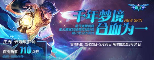 庄周云端筑梦师将在2月22日限时上架出售,原价888点券的梦幻鲲,首周只卖710点券。这款皮肤将限时出售一个多月,在3月31日下架商城。
