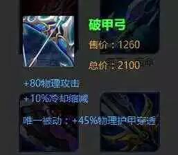 假设敌方拥有1000点护甲,那么在有破甲弓的我们面前,他实际的护甲就只有1000*(1-45%)=550点护甲值;假设其拥有500点护甲,在破甲弓面前就只有500*(1-45%)=275点护甲值