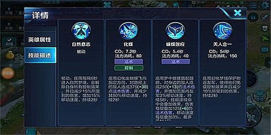 技能解析:庄周幻化成蝴蝶飞向指定方向,对路径上的敌人造成法术伤害,并减少其50%移动速度,持续两秒。一技能是其副点技能,主要是用来辅助队友留人和逃跑使用。