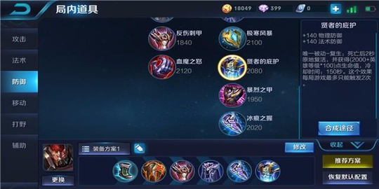 出装推荐:抵抗之靴+红莲斗篷+反伤刺甲+魔女斗篷+冰痕之握+贤者的庇护