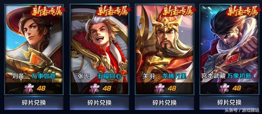 本周碎片商店还上架了四款拜年团开黑皮肤,分别是张飞、关羽、刘备和宫本武藏的新春专属,兑换仅需48碎片,而列表或许下周就会换新,因此有需求的小伙伴可别错过了!另外还有两款勇者皮肤露娜的哥特玫瑰和花木兰的兔女郎也值得兑换哦!