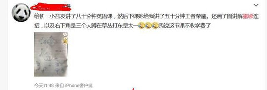 这是这位老师的晒图,大致意思就是给初一的小朋友上课讲了八十多分钟的英语课,学习了50五十分钟的露娜玩法,还画了图解,让老师不好意思收学费了!