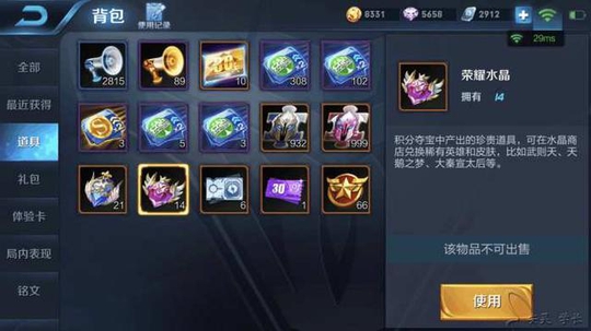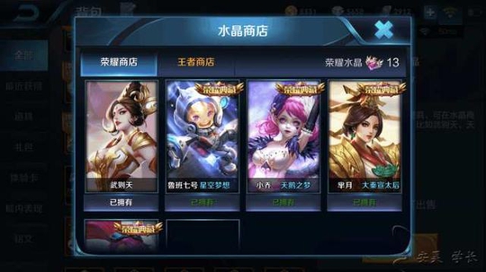 不用多说,相信目前还是有不少土豪玩家仓库中还有多余的荣耀水晶,如果说一年推出一款荣耀商店的皮肤,那么随便存10个荣耀水晶都够天美出十年新皮肤了,这是多么恐怖的事情,这位玩家还拥有14个荣耀水晶,兑换了星空梦想剩下13个,怎么说也够天美出13年的新皮肤了!