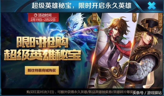 今天除了中路投票开启外,还限时上架了超级英雄秘宝,活动持续到2月22日结束,超级秘宝其实就是此前的幸运英雄宝箱,可抽取的永久英雄有18888李白和钟馗、13888马可波罗,另外奖励还包含了新品英雄抽奖券、2个英雄碎片和20钻石,相信大家对概率都有所了解,可依据自身需求选择抽取!
