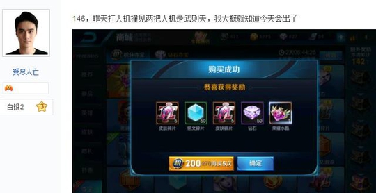 玩家146幸运值抽出荣耀水晶,昨天打人机撞见两把人机是武则天,大概就知道今天会出了。。。。