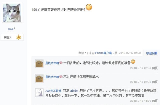 一个玩家抽到了150幸运值,准备明天5点继续抽,目前为止抽了3次五连抽,起初只是为了皮肤碎片换英雄跟皮肤缺两个,就抽一下,第一次中死神,第二次中冰冠,第三次中嬴政,现在入坑了,觉得运气好可以很快开出荣耀水晶,但至今未出!