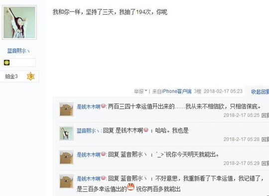 并不是一个网友为了积分夺宝而熬夜到5点,很多网友正在经历这同样的事情,有的网友两百多幸运值就可以抽到,有些玩家则需要抽到300多,甚至361点幸运值为止。