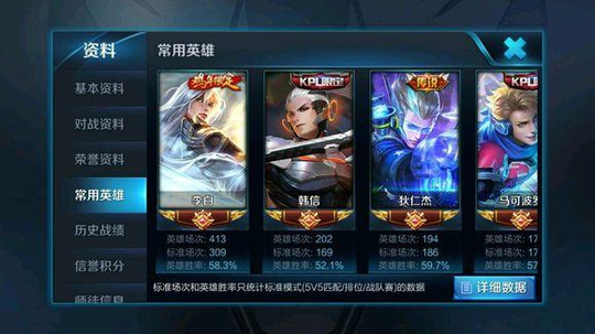 李白鸡年限定皮肤、韩信KPL限定皮肤、狄仁杰传说皮肤,马可波罗KPL限定皮肤等等,李白413场胜率58.3,韩信胜率52.1,狄仁杰胜率59.7