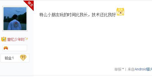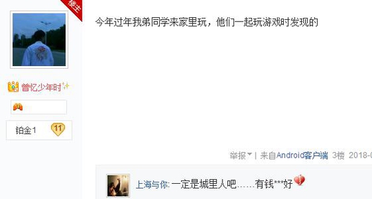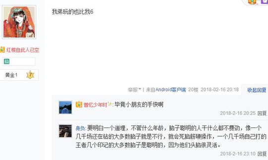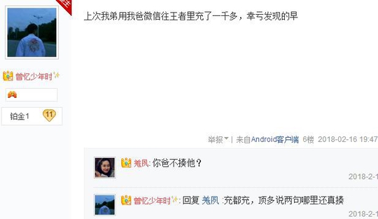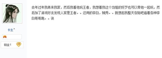 一个网友:“去年过年我弟来我家,然后我看他玩王者,我想着我这个当姐的好歹也可以带他一起玩,然后加了游戏好友发现人家是王者。。还用的李白,贼秀。。就想起我整天在贴吧追着各种李白哥哥跑。。诶”