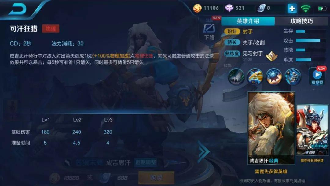 由于大招冷却时间短,可以储备箭矢释放,这使得宗师之力的被动能够提升前期成吉思汗的输出,加快发育的节奏;