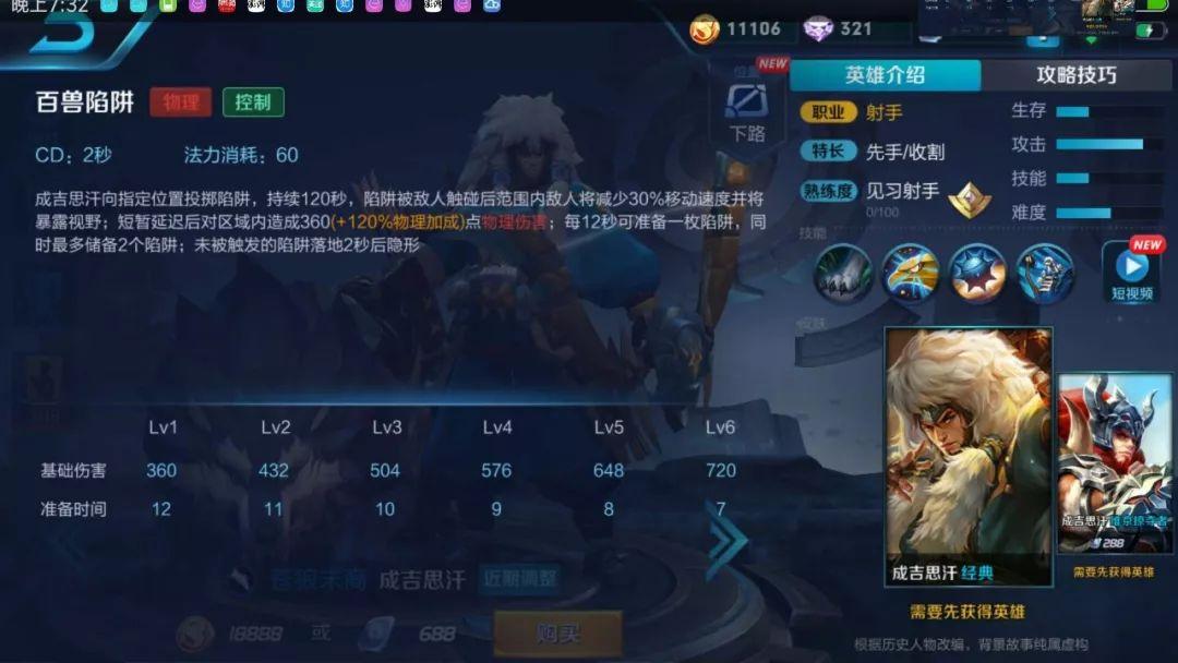 这个技能可以为成吉思汗提供视野 ,有效地防被gank。同时使用该技能攻击敌人时,三发箭矢能够造成高额伤害,一技能也是主加技能。