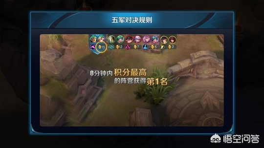所谓的五军对决,因为取消了防御塔和水晶这种设计,虽然最后判定名次是依照积分来判定的,但其实对积分影响非常大的因素在于人头,所以使得原来的moba推塔模式变成了一个随时可能发生小型团战的游戏模式。