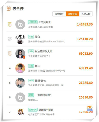 看完人气榜,NB小编在和大家看下吸金榜,过年期间大家手上的压岁钱和红包多了,主播的礼物也是直线上升,其中电竞老王以142483夺取礼物价值榜第一,而骚白则是以125110位居第二位,也是吸金超级高的一位主播。而张大仙的吸金量则是相对前两位有点偏低,不过仍旧以69012位居第三位,这个吸金量可能是平时一周的总和了。