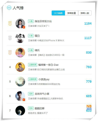 企鹅电竞的第一李白和小浪浪则是排在第四五位,人气也是不错的。龙珠平台的小草和酷酷的滕排名六七位。基本上整个王者荣耀榜单由斗鱼,企鹅,龙珠三家平台霸占。
