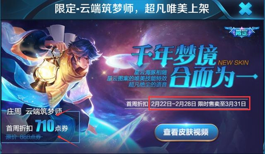 今天新皮肤上线了,新皮肤云端筑梦师,如梦幻般,星空璀璨!