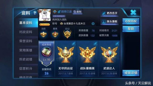 如上图所示,这位玩家当前段位已经是最强王者,最高更是获得过荣耀王者!拥有所有的英雄,皮肤数量拥有132个,这个就有点牛比了!3100多场对局牛比赞将近2000次,而成就等级更是高达95级,全服排名第26!