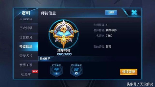 马上5级的精英导师,大家都知道在王者荣耀当中,提升名师点是多么难的事情,因为这不是金钱就可以购买到的,需要大量的时间以及人力去做,才能获得回报,而且很少能遇到愿意一起做任务的徒弟,所以能看出他的毅力也是顶尖的!