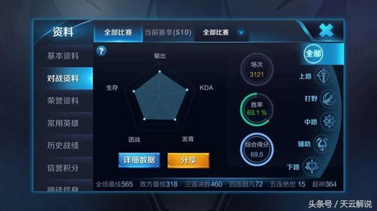 全场最佳500多场,败方最佳300多次,15次五连决胜以及360+超神次数,虽然是所有比赛的战绩,但也可以看出来号主不俗的技术!3100多次对战63.1%的胜率,综合得分69.5,笔者甘拜下风,所认识里的人也很少有这样的大神!