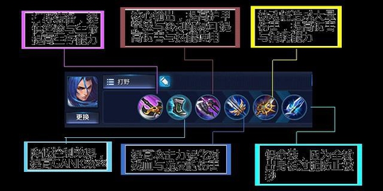 打野:打野橘右京前期比较注重发育,所以需要控好自家野区的经济。因为橘右京前期伤害高控制足的特点所以可以视情况的去反野,主动反野可以较好的确保自身前期的经济发育,而如果队友配合默契的话当然也可以选择反蹲,蹲守的话讲究打敌人一个出其不意,快速建立前期优势。