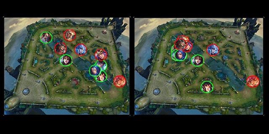 这里加大之所以用括号是因为要视情况而定,这种消耗方式是用于双方的拉锯战,在彼此都想依靠远程技能去相互消耗的时候,此时一般只有法师与射手会上前利用技能消耗,而前排最多只能在他们身边甚至在后面,在这种情况下橘右京可以出其不意的在对方上前消耗的时候以一技能拉近距离打出远程被动,然后果断接上二技能眩晕控制,如果此时二技能成功命中且敌方辅助一时无法上前保护,便可以果断交出大招将其打残或收割,那么此时在敌方少人的情况下便可以顺势上前逼团。