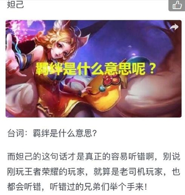 第一名大家肯定猜到了,那就是妲己。台词本身是羁绊是什么意思呢?但是90%以上玩家估计都听成了XX是什么意思?我不多说大家也应该懂了。老司机不妨在评论区施展才华。