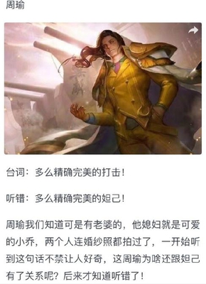周瑜在法师中独树一帜,虽然没有位移让他的出场率并不高。但极高的范围和后期伤害,让不少玩家十分头疼。他的台词中打击经常被玩家误读为妲己,不过也有玩家表示两个是不同时代的人物,是很容易区分的。