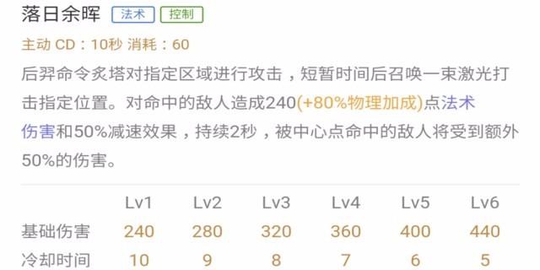 数值分析:该技能基础伤害和冷却时间的成长属性都很高,高额的物理加成和减速效果对后期的团战有巨大帮助,推荐主加该技能。