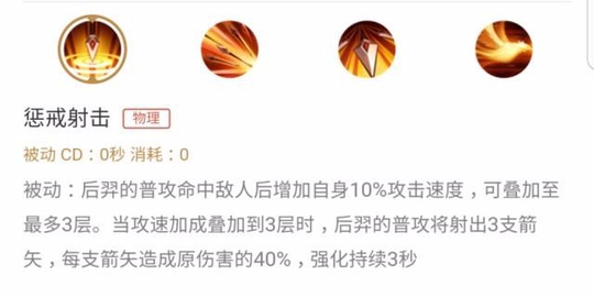 整体分析:被动技能大大提高了后羿的普攻的伤害,这也提示我们后羿主要的伤害是来自他的普攻,在实战对线中可以先普攻小兵,强化普攻后再接近敌方英雄打出爆发输出。