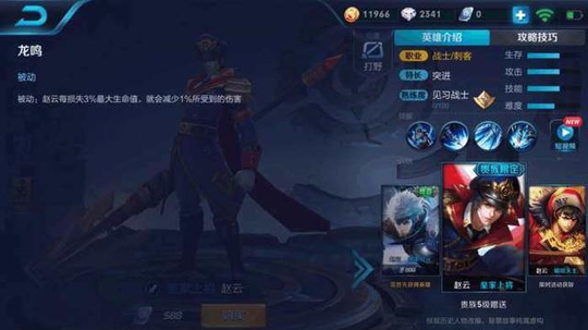 TOP2:赵云,被动:龙鸣,赵云,每损失百分之3最大生命值,就会减少百分之1所受到的伤害。这个被动可以说毫无作用,百分之1的伤害简直可以忽略,和项羽的被动比起来,这个可以说是弱化版的。