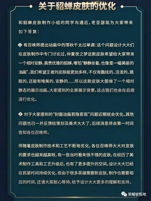 1.貂蝉仲夏夜之梦优化。这款皮肤也是被玩家们吐槽了很久,传说级1788的售价竟然是这样的货色,跟皮肤制作小组的同学沟通之后,会继续优化这款皮肤,全屏展示背景只有也会上线,不过还需要时间。
