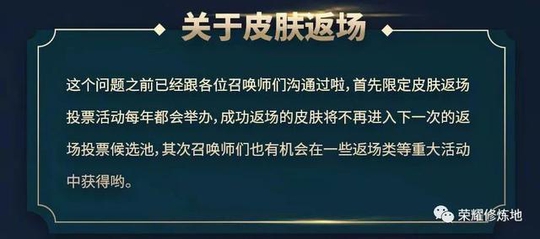 3.皮肤返场问题。春节期间返场的霸王别姬着实让玩家惊喜了一把,没把握住机会的就别想了,返场之后的皮肤下次不再参与活动,另外,天美今后每年都会在周年庆(10月)搞一次投票返场,下一次冰封没意外了吧?