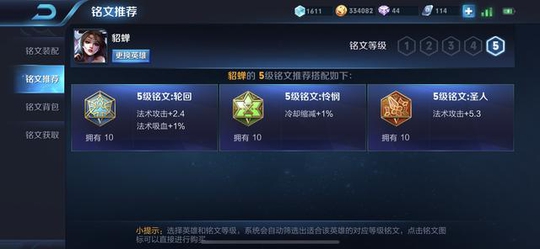 首先,我们来看看系统推荐的貂蝉铭文,推荐的是轮回、怜悯、圣人,吸血、法术攻击先不看,重点在于怜悯,这里系统推荐10个怜悯,也就是10%的冷却。