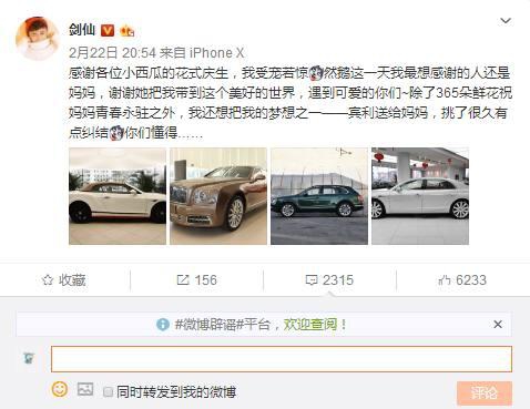 看来“儿媳妇”们为了剑仙也是蛮拼的,竞争贼激烈!对于剑仙这波过生日给老妈送宾利,你有什么看法?欢迎在评论处留言说说你的看法!