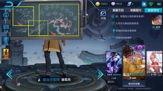 而第三张呢是诸葛亮的黄金分割率皮肤,我们知道诸葛亮是拥有一个小黑板的,除了在正面跟学生们讲题之外,在后边也写着很多东西哦,比如现在画的应该就是刚刚上场的新皮肤吧!,不过左上角那个我没看懂!