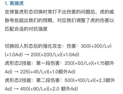 从第一行可以看到修复了一下Bug,但是看到后面就让人觉得事情不简单了,这种伤害削弱力度简直就要削废的节奏好吧,心疼赔钱虎一秒。