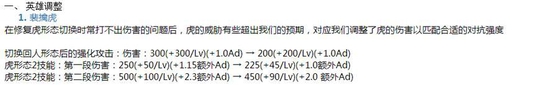 而裴擒虎的二段跳削弱的就更多了,满级神装情况下大约伤害低了300-400左右,不过要仅仅只是这些削弱,我们可以说他还是一次平衡性调整,真正毁掉这个英雄的还是被动虎形态切换成人形态的伤害调整,满级神装的情况下整整比之前低了1600,这样一个数据对英雄的爆发影响还是很大的,相当于普通射手后期神装平A三下到四下这个样子,这种情况下,裴擒虎相当于被大削了!