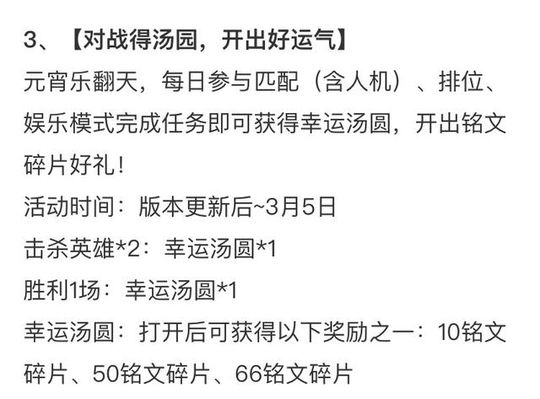 每天参与匹配(含人机)、排位、娱乐模式完成活动任务可以获得幸运汤圆,打开幸运汤圆可获得:10个铭文、50个铭文、66个铭文三种奖品的其中一种。