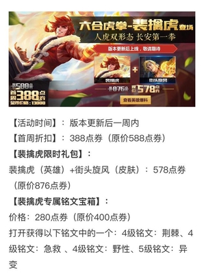 售价依旧是13888金币或是588点卷。点卷售价首周有折扣,搭配伴生皮肤“街头旋风”一起购买更划算!