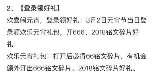 3月2日元宵当天登录游戏可领取欢乐元宵礼包。打开欢乐元宵礼包保底可开出66个铭文碎片,运气好点的小伙伴能额外开出666个铭文碎片,欧皇可以额外开出2018个铭文碎片哦!