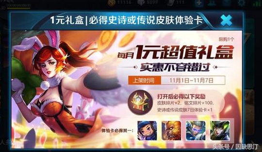 首先神秘商店就不说了,那都是过年前的东西了。接着的活动又是我们熟悉的“1元礼盒”,花1元购买史诗皮肤体验卡。