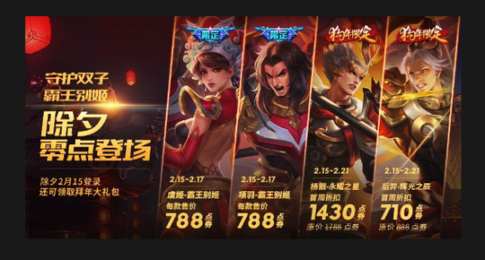 除夕(2月15日)零点, 杨戬后羿狗年 限定皮肤 携手 霸王别姬 正式登录王者荣耀商城,相聚 除夕 共迎新春!