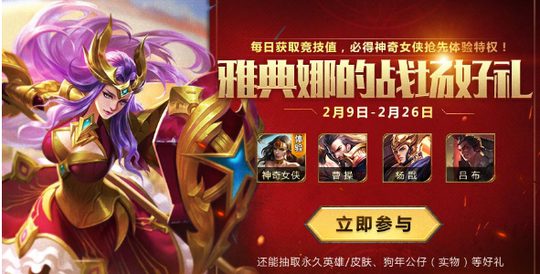 每日完成游戏内对局任务,可获得竞技值,竞技值可用于抽取永久英雄皮肤等好礼,更有雅典娜史诗皮肤-神奇女侠抢先体验特权等你拿