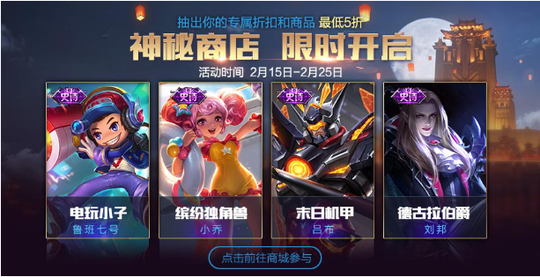 除夕0点 开启神秘商店, 最低 可达 5折 , 30款热门 英雄皮肤 任性 选购 ! ~
