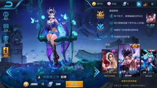 但就特效来看,虽然不是独立背景但也算得上是半独立背景,依靠在秋千上的造型还是很赏心悦目的,而在特效方面主要借助这蝴蝶的元素,那种渐进展开然后消逝的蝴蝶效果算是王者荣耀中的极致了。