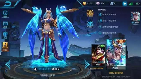 海洋之心本身也没有极其特别的特色,元素设计主要是水,整个下身都是蓝汪汪的海水构成的,看起来倒也是别具一格,但真正重要的在于武则天这个英雄本身,武则天和前面的小乔天鹅湖之梦一样,获取方式也是积分夺宝,所以武则天被认为土豪玩家专属英雄,而但凡有武则天的玩家,记不太在意再画一百多块买个海洋之心,尽管武则天还有一款东方不败的皮肤。