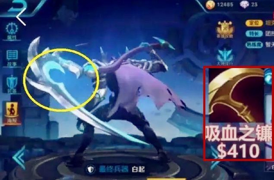 白起的武器是一把巨大的镰刀,这把镰刀非常像游戏中的吸血之镰。咱们都知道白起的一技能是可以给自己回血的,我想估计就是因为装备了吸血之镰才可以拥有这样的吸血效果的。但是吸血之镰总归是比较低级的装备,吸血效果不是特别强,所以咱们的白起还是做坦克更为合适~
