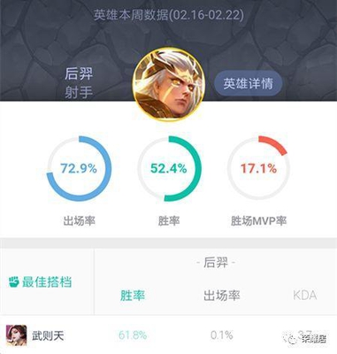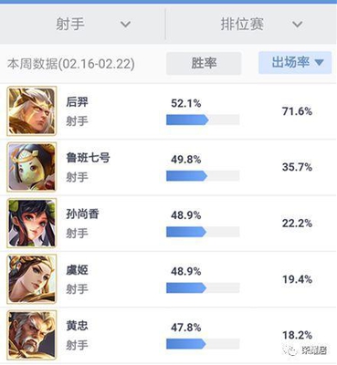为啥说后羿是第一射手呢?因为从目前一周的数据来看,后羿的出场率达到了惊人的71.6%,在全英雄中的出场率排第一。要知道,射手中出场率排在第二位的鲁班,仅仅只有后羿出场率的一半。