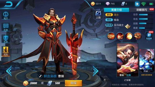 曹操这个英雄的整体胜率是45%,在所有英雄中排到倒数第二。曹操这个英雄曾经是很多玩家最喜爱的一位英雄,后来被削后,变成了一个比较弱的战士,伤害也不是那么的高,团战也很无力,刚开始被削的时候,曹操的出场率一下就低了下来,曾经的王者跌落神坛,如今曹操有着不高不低的出场率,但是曹操的胜率真的是很低,我只能说是改版把这个英雄改废了。