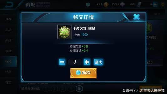 推荐铭文。买对的铭文不要走弯路,移速百穿,这套适用大部分刺客、战士、坦克、射手,建议优先买这套。如果喜欢玩法师,建议16%法术吸血,10%减CD,法穿法强这套,法系万金油铭文。